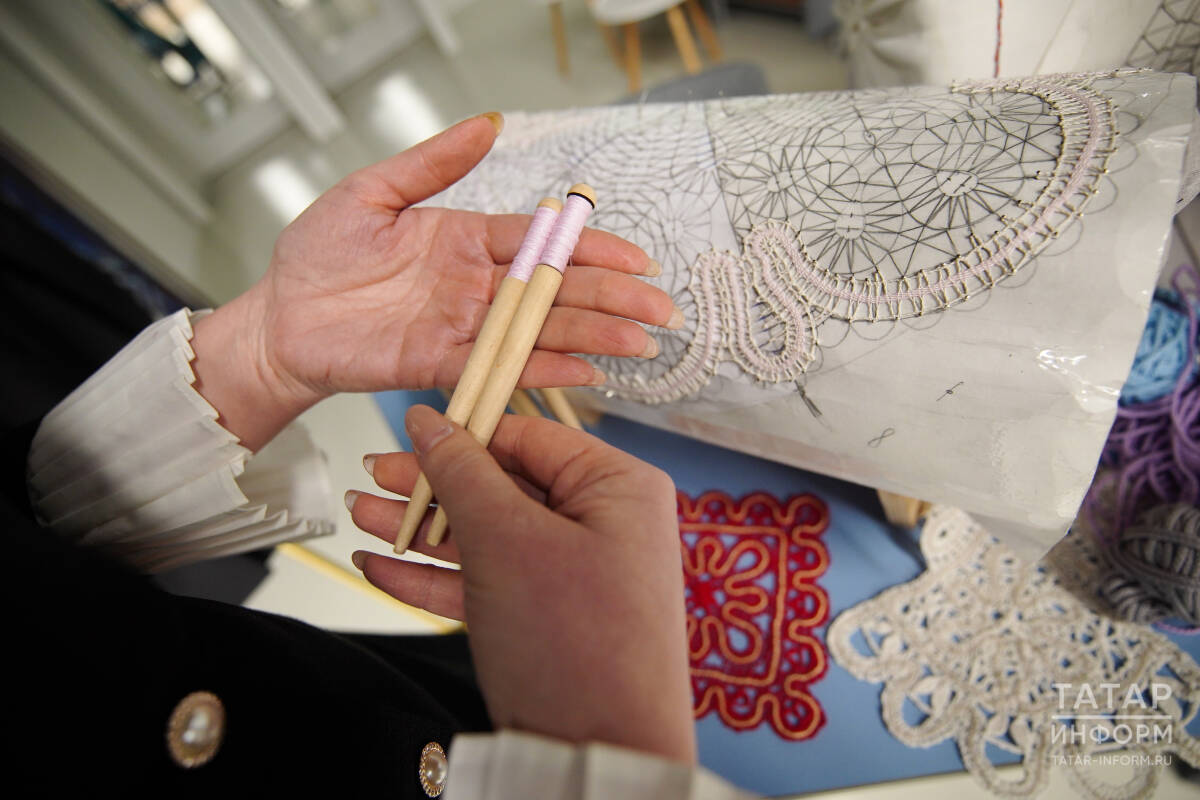 Во время экскурсии журналисты также побывали на мастер-классах. Корреспондент «Татар-информа» посетила занятие по ныртинскому плетеному кружеву – уникальному виду народного промысла. Кружево создают по сколку – схеме в натуральную величину, закрепленной на валике, а плетут его с помощью коклюшек. Работа требует терпения: небольшое изделие мастерица делает около двух недель. Цена зависит от масштаба – например, кружевной зонт может стоить от 100 тысяч рублей, ведь каждое изделие создается в единственном экземпляре.