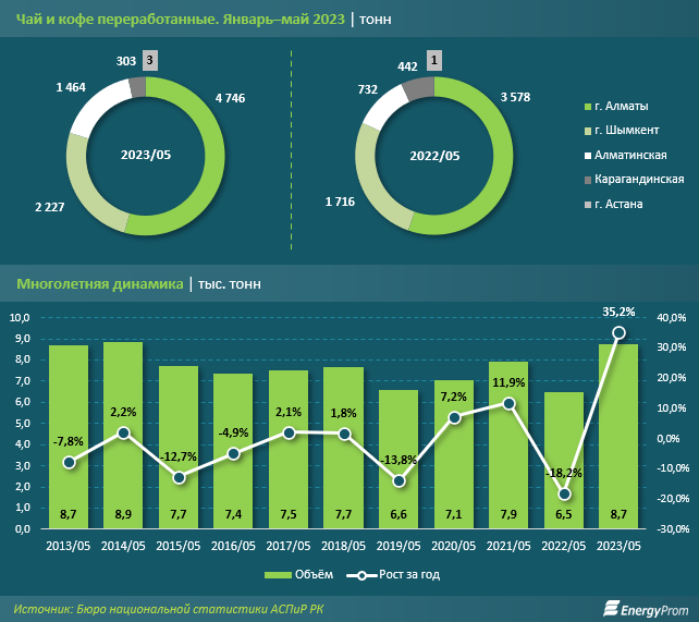 В региональном разрезе более половины производства чая и кофе пришлось лишь на Алматы: 4,7 тысячи тонн, на 32,6% больше, чем в аналогичном периоде прошлого года. Значительные объёмы выпуска отмечены также в Шымкенте (2,2 тысячи тонн) и Алматинской области (1,5 тысячи тонн).