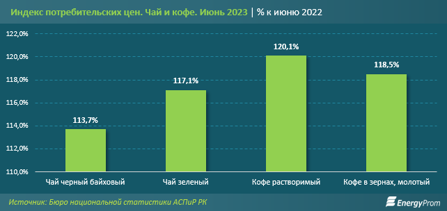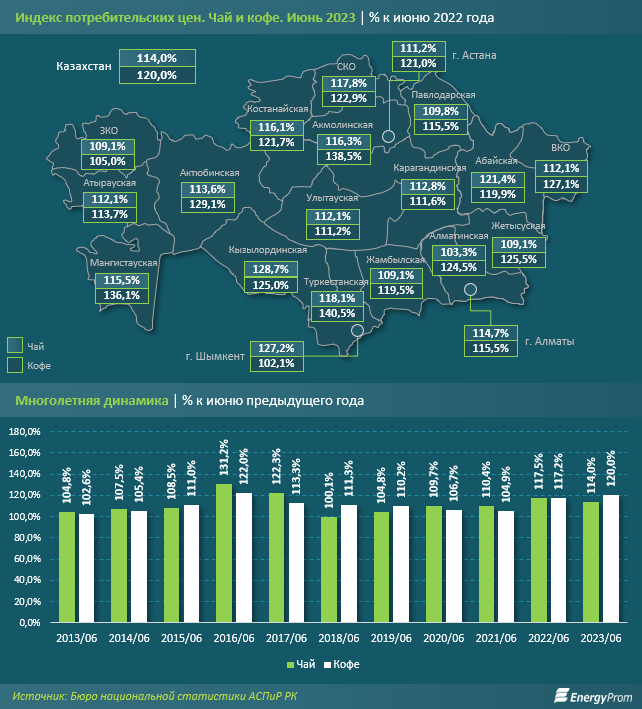 В региональном разрезе самый высокий годовой рост цен на кофе был отмечен в Туркестанской области – сразу на 40,5%, далее идут Акмолинская и Мангистауская области – плюс 38,5% и 36,1% за год соответственно.
