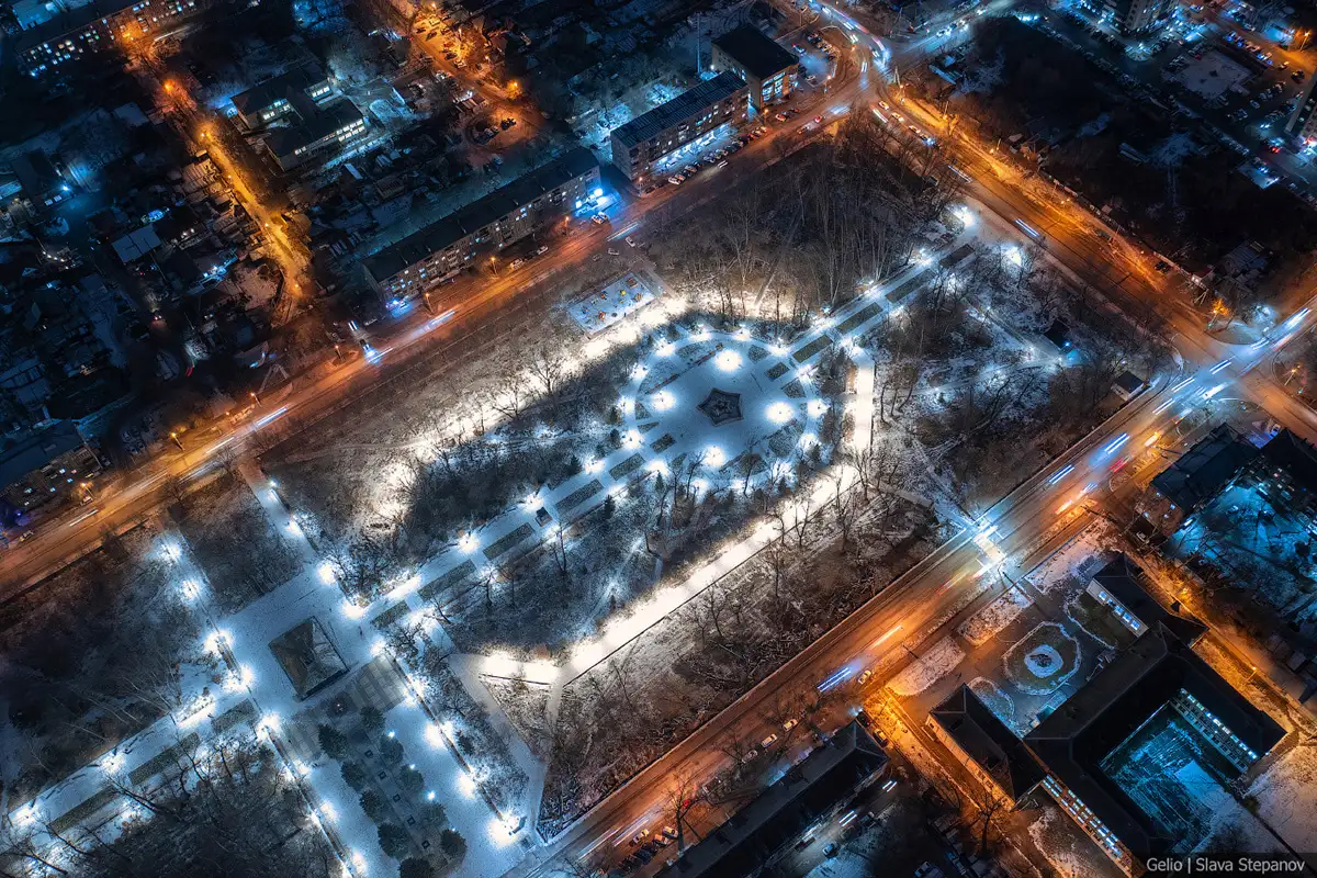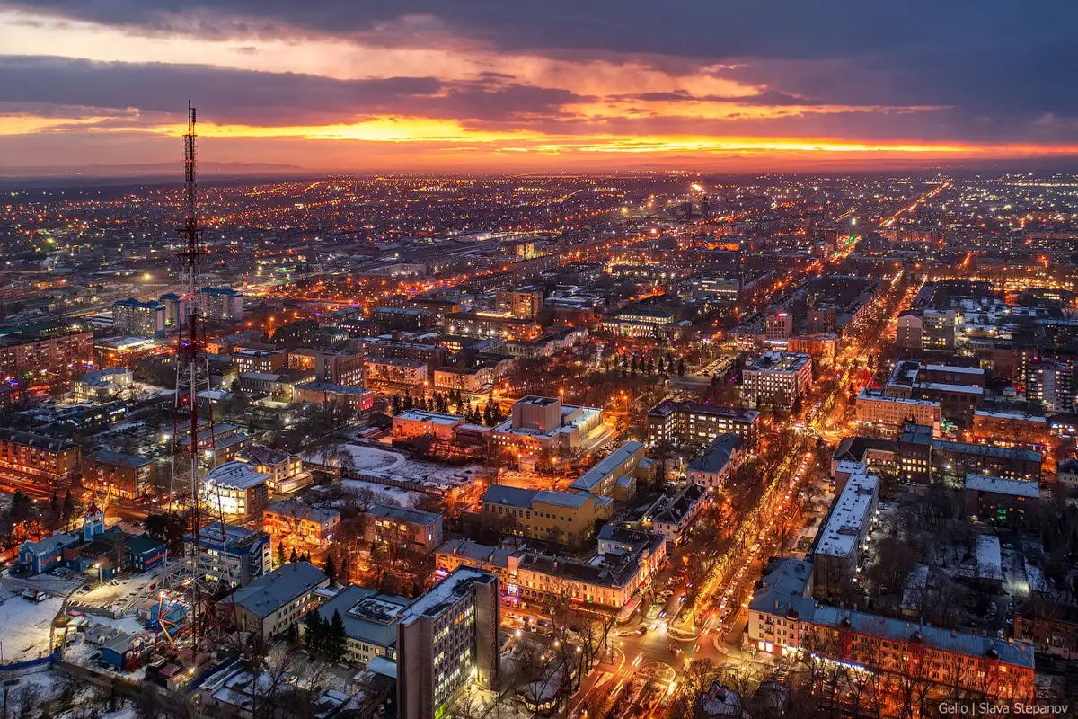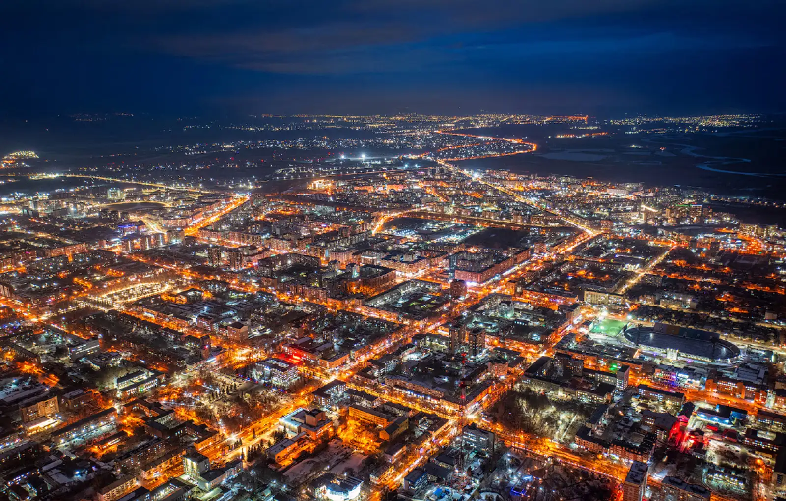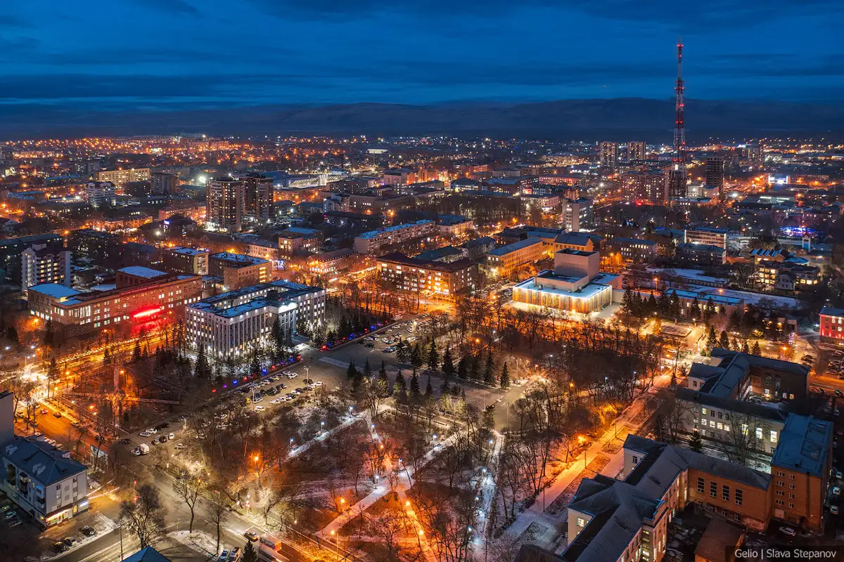 13. Абакан постепенно растёт, появляются новые здания. Сейчас это 99-й по численности город страны — здесь живёт более 180 тысяч человек, примерно треть населения республики. С высоты, а особенно при вечернем освещении улиц, хорошо видна структура застройки, новые жилые кварталы и связь исторического центра с современными районами.