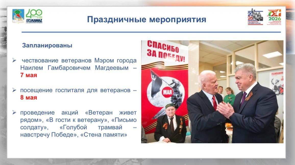 Торжественные мероприятия с участием ветеранов запланированы на 7 и 8 мая. В частности, 7 мая праздничное событие пройдёт в Казани с участием Рустама Минниханова, в Набережных Челнах ветеранов поздравит мэр города Наиль Магдеев. 8 мая глава города посетит госпиталь для ветеранов войн.