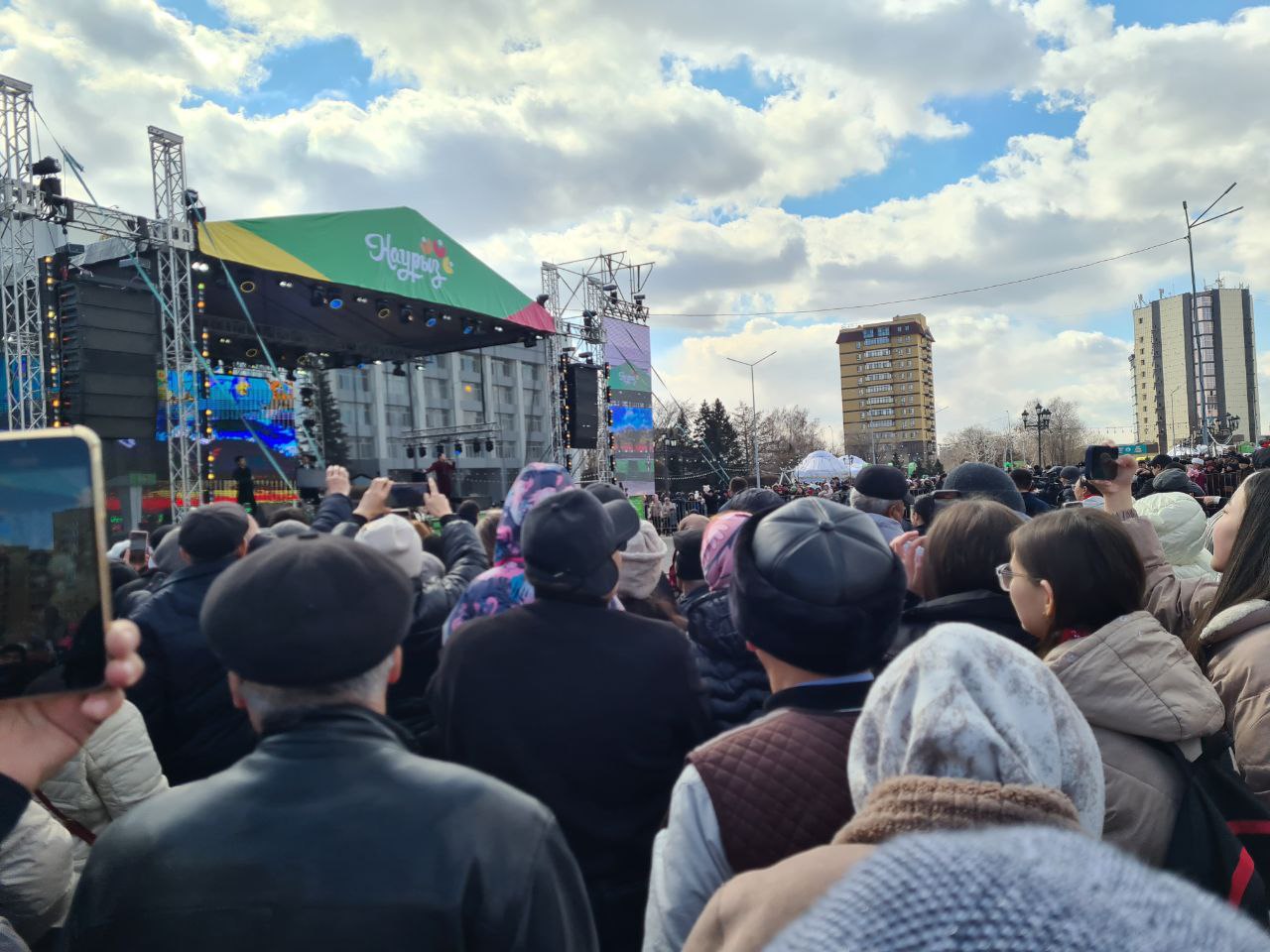 На главной сцене горожанам показали театрализованное представление, аким области выступил с поздравлением, и начался концерт с участием как местных артистов, так и казахстанских звезд.