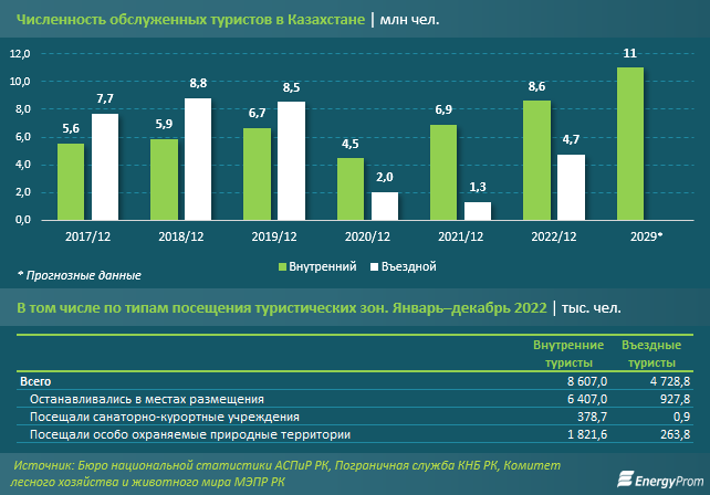 Один из индикаторов концепции − численность внутренних и иностранных туристов. По данным Бюро национальной статистики АСПиР РК, в прошлом году Казахстан посетили 4,7 миллиона иностранцев, внутренними туристами считались 8,6 миллиона граждан. В планах профильного ведомства к 2029 году довести число путешествующих казахстанцев до 11 миллионов человек. Недавно мы писали о том, почему на самом деле нельзя все 8,6 миллиона внутренних посетителей считать туристами. Две трети из их числа − это люди, которые просто совершали поездки в другой город или регион к родственникам.