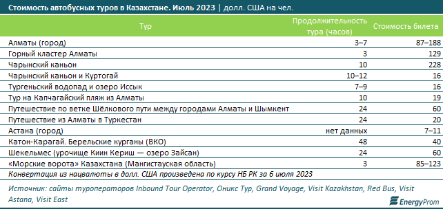 Средние цены на загородные автобусные туры в Алматинской области продолжительностью не более одного дня колеблются в пределах от семи тысяч до 8,5 тысячи тенге (или 16-19 долларов США) за одного человека. Многодневные экскурсии дороже − от 9 тысяч до 55 тысяч тенге (или 20-123 долларов США). В их стоимость включены дополнительные услуги, начиная от питания и заканчивая кемпингом. Вилка цен большая, так как конечная стоимость билета для туриста зависит кроме всего прочего от численности группы. Если туристов собралось мало, то их возят на небольших микроавтобусах, если желающих много − на больших 50-местных автобусах.