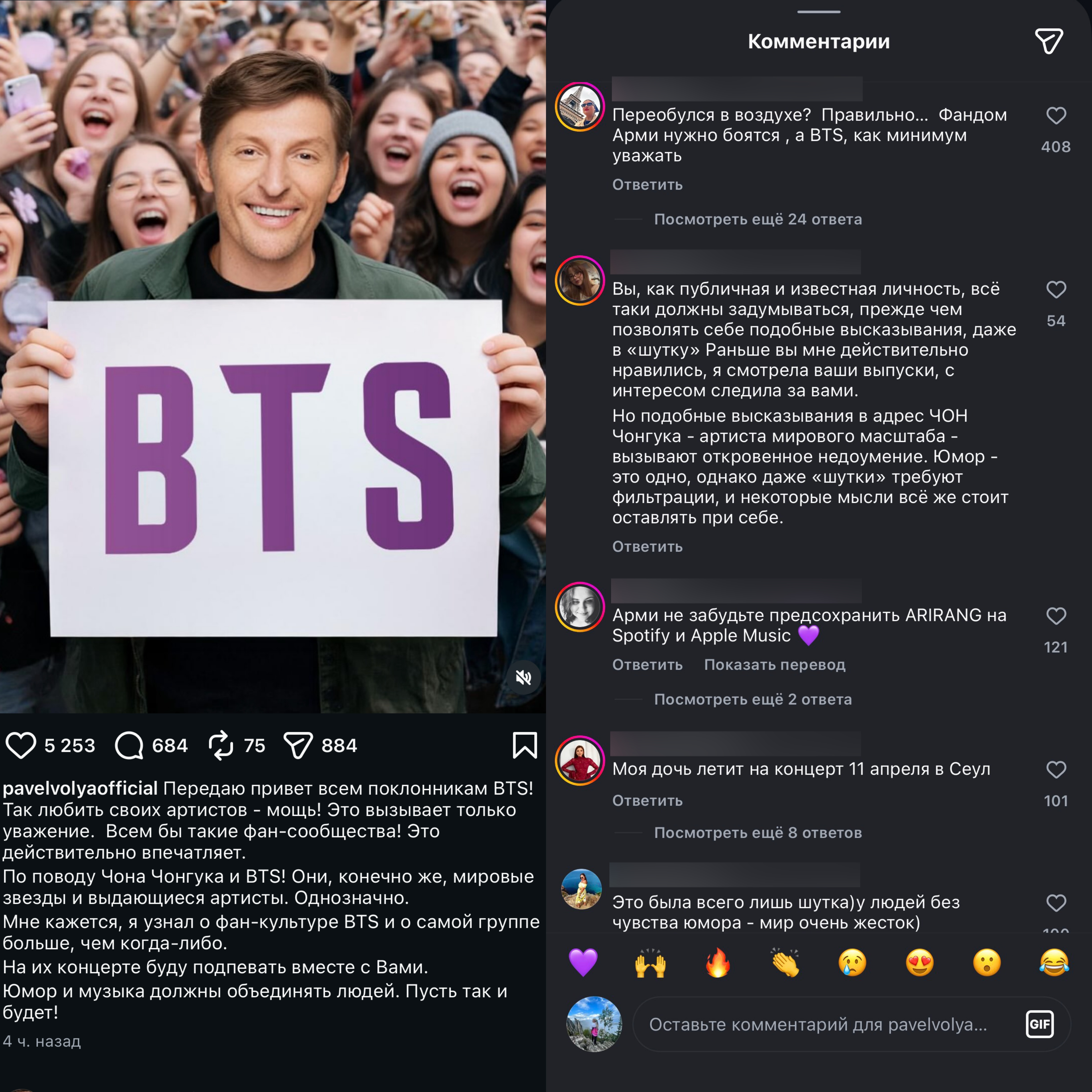 В комментариях фанаты BTS оставляют множество эмодзи фиолетовых сердец — их главный символ