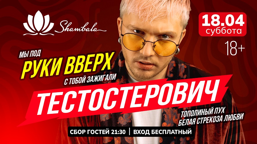 Главная апрельская вечеринка. Артист Тестостерович — автор хита «Под руки вверх», который стал настоящим гимном для всех поклонников группы. После мощного выступления «Руки Вверх» приглашаем гостей продолжить праздник в «Шамбале»: зажигательные хиты, фирменный юмор, танцевальный драйв и атмосфера, в которой хочется оставаться до самого утра.